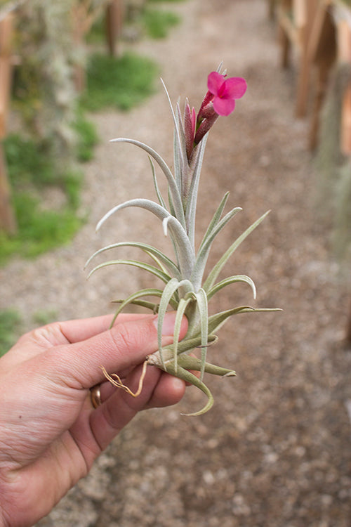 Tillandsia Mystic Burgundy (a hybrid of T. albertiana and T. muhrii) is an eye-catching air plant known for its vibrant, deep red or burgundy bracts, which stand out beautifully against its silver, slender leaves. The plant forms a compact rosette, and its striking color intensifies when it blooms, typically showcasing bright red or purple flowers.