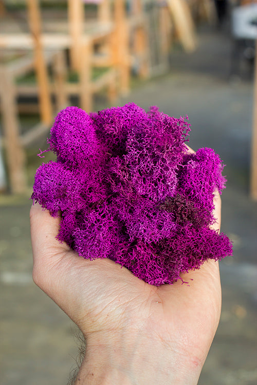 This is dyed and dried reindeer moss. It is great for designing with, and does not require water.