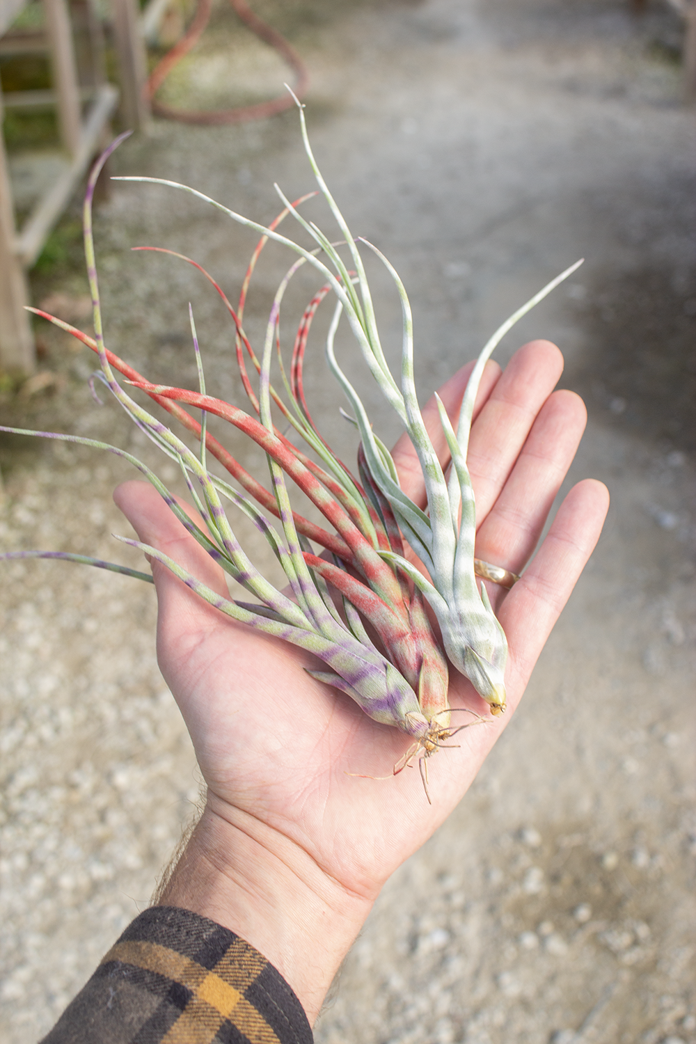 Tillandsia baileyi hybrid is a captivating air plant known for its slender, twisting leaves and its hardy nature. The leaves are typically green with a light silver tint, thanks to its fine trichomes, and they grow in a graceful, arching manner. This hybrid variety often blooms with striking purple flowers.