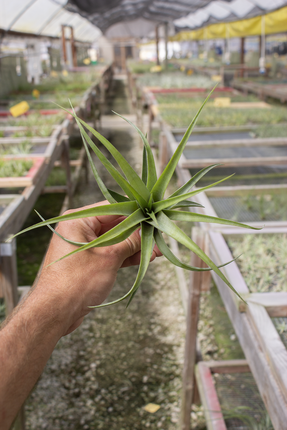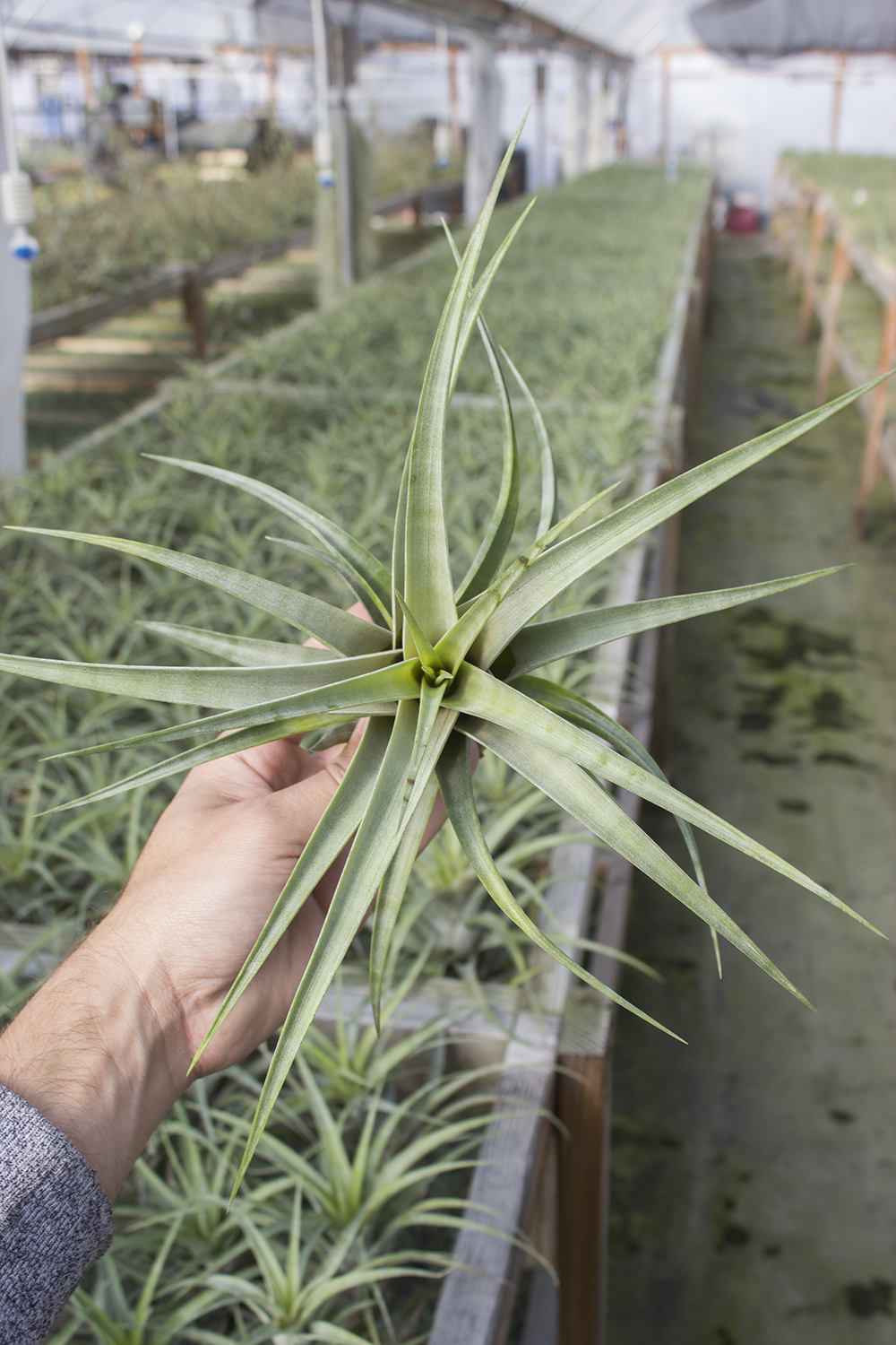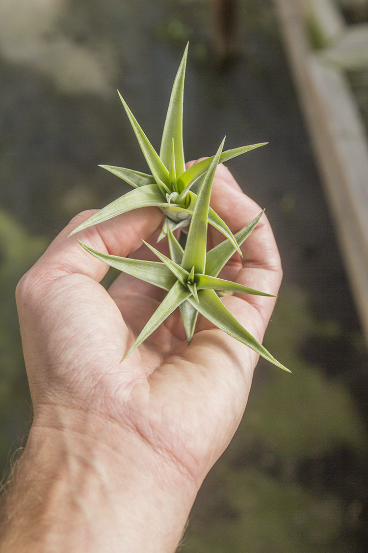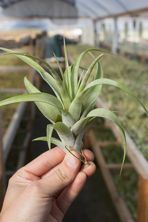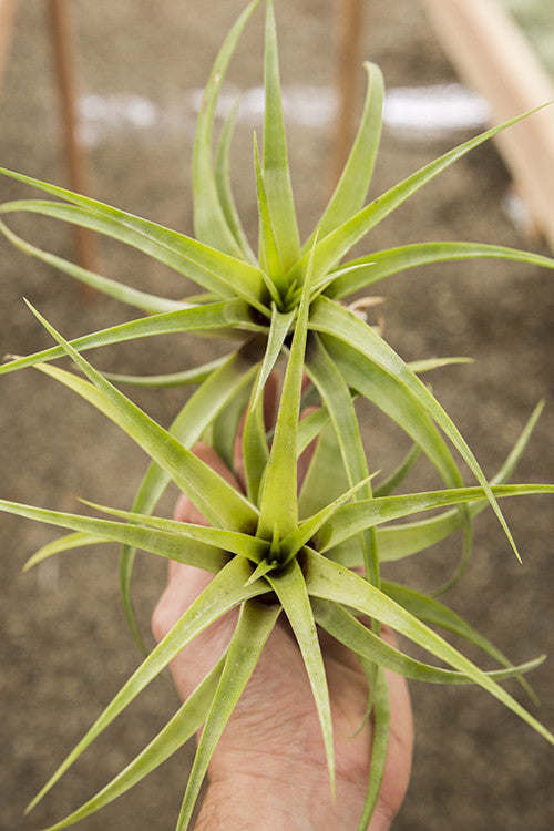 This variety is unusual because it grows pups right on its inflorescence. This plant is deep green, and can grow up to 14" wide.